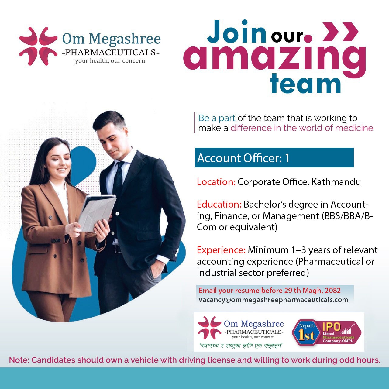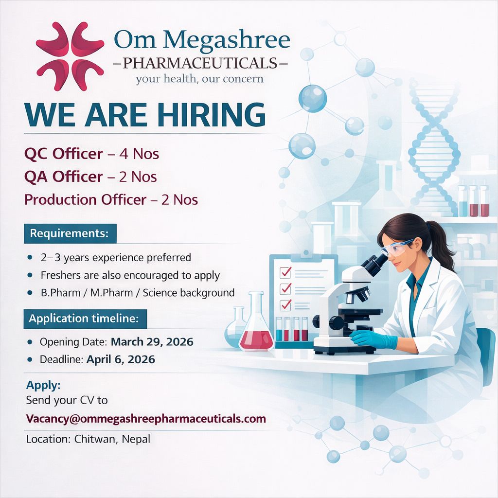 If you are passionate about ensuring the quality and safety of pharmaceutical products, we encourage you to apply for the position of above vacancy announced. Please submit your resume and a cover letter outlining your qualifications and enthusiasm for this role to vacancy@ommegashreepharmaceuticals.com Join us in our commitment to delivering top-quality pharmaceuticals and making a positive impact on healthcare.